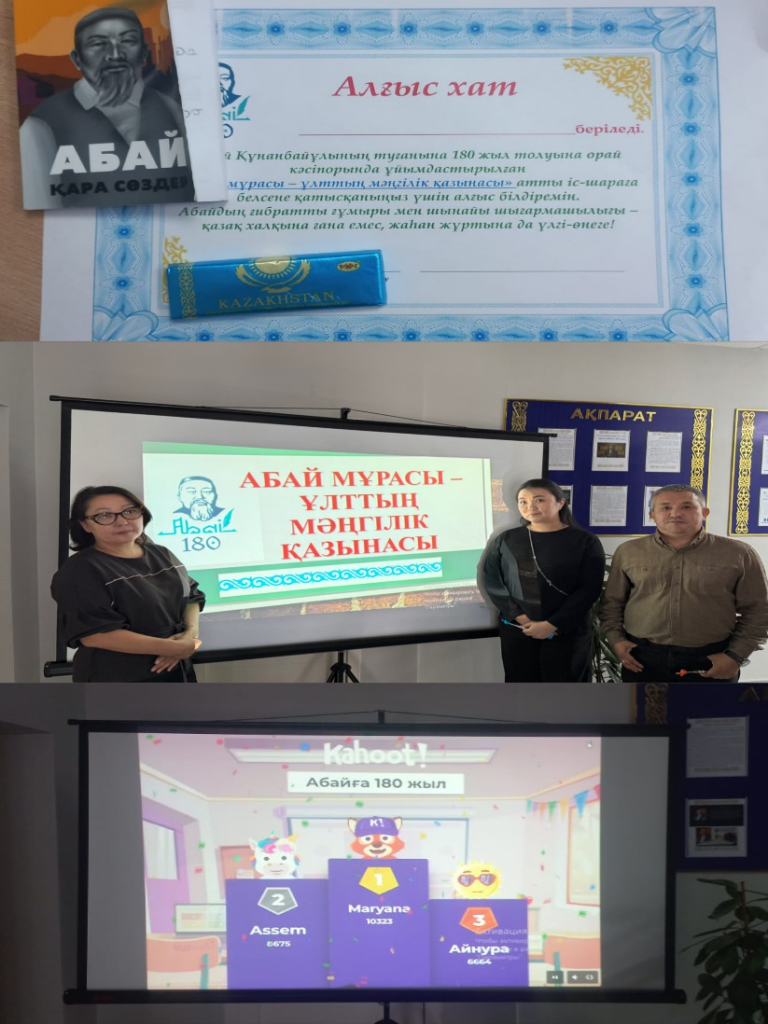 Ұлы ақын Абай Құнанбайұлының 180 жылдық мерейтойы аясында 8 тамыз күні «Кеме қатынасының тіркелімі» филиалында «Абай мұрасы – ұлттық мәңгілік қазынасы» атты іс-шара өтті. Іс-шарада ақынның өмірі мен шығармашылығы туралы слайд көрсетіліп, жұмыскерлер арасында Kahoot платформасында викториналық ойын ойнатылды.